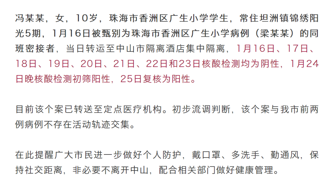 1月25日17时许,“中山发布”披露:2022年1月25日,中山市在珠海病例关联的密接隔离人员中新发现1例无症状感染者。