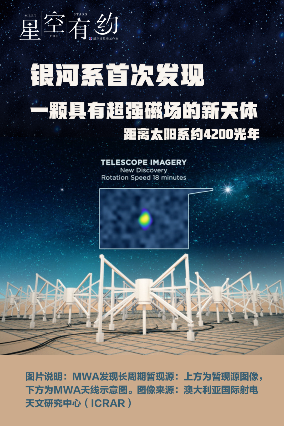 深邃浩瀚的星空,充满了太多科学奥秘,人类探索的脚步从未停歇。通过分析平方公里阵列(SKA)低频先导望远镜的巡天观测数据,中外天文学家首次在银河系发现一颗具有超强磁场的新天体,距离太阳系约4200光年。27日,国际权威期刊《自然》(Nature)杂志在线发表了这项研究成果。平方公里阵列(SKA)是由全球十多个国家合资建造、世界最大的综合孔径射电望远镜,因接收总面积约“1平方公里”而得名,于2021年7月正式启动建设。在SKA建成前,有几个先导望远镜已经在运行。其中,低频先导望远镜“默奇森宽场阵列(Murchison Widefield Array,MWA)”位于澳大利亚。中国科学院上海天文台科研人员张翔与澳大利亚合作者、科廷大学国际射电天文研究中心(ICRAR-Curtin)的Hurley-Walker博士等中外科研人员,通过分析MWA 的巡天观测数据,意外地发现一颗位于银河系内具有超强磁场的新天体—一个具有异常缓慢周期性辐射的射电暂现源。