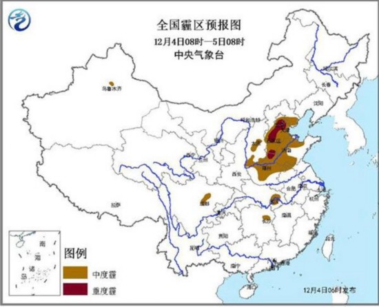 今天白天起,受弱冷空气影响,华北中部的雾霾将率先减弱,而华北南部和黄淮西部的雾霾还会维持甚至加重。中央气象台12月4日06时继续发布霾橙色预警:预计,4日08时至5日08时,北京中南部、天津、河北中南部、山东中西部、河南北部、山西中南部等地的部分地区有中度霾,其中,北京南部、河北中南部、山东西部、河南北部等地的部分地区有重度霾,河北中南部局部地区PM2.5峰值浓度可达500微克每立方米以上,最低能见度不足200米。