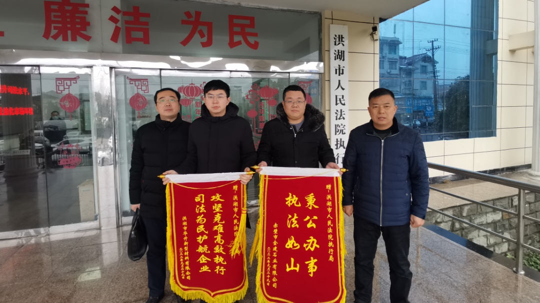 “太不容易了,能在春节前执行到位,企业让我来向你们表示感谢。”1月29日,洪湖法院执行局高效快速执结两起涉企案件,涉案金额共1370余万元。某市石业有限公司及某市新型材料有限公司委托代理人向洪湖法院执行局赠送两面锦旗,以感谢执行局高效执行,为企业健康发展提供有力司法保障。