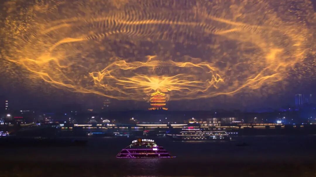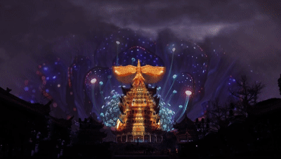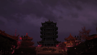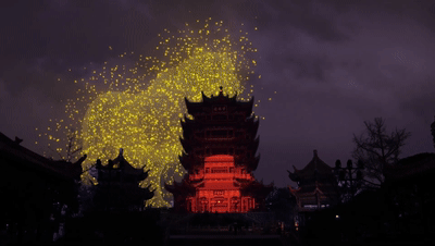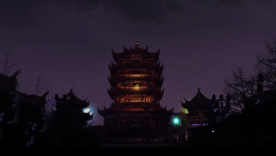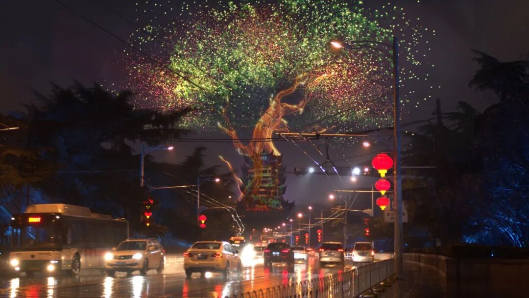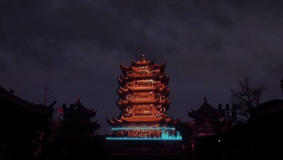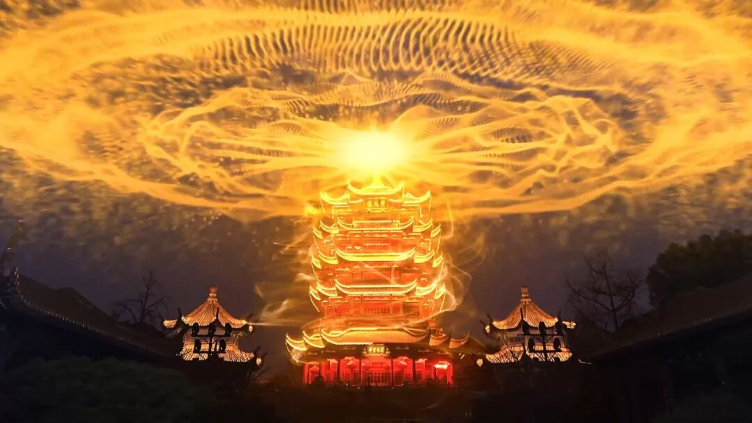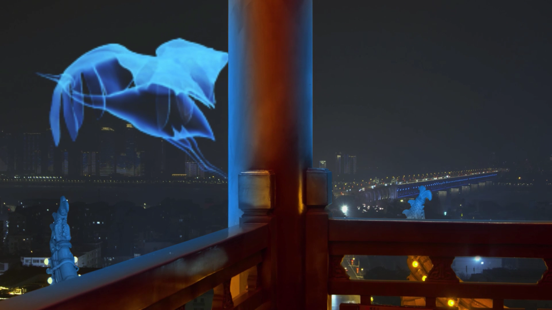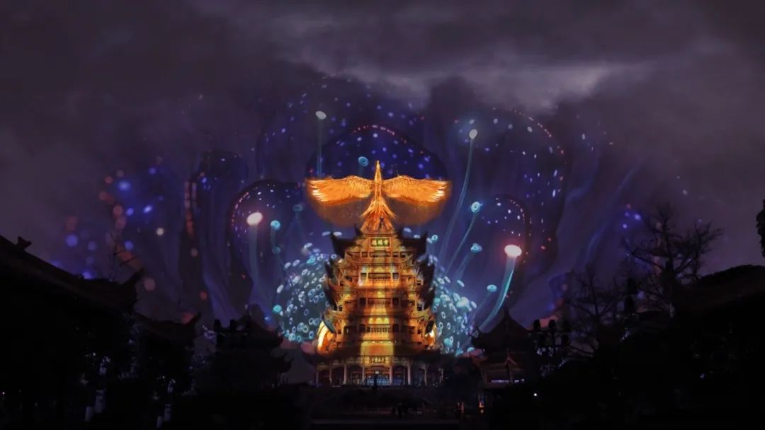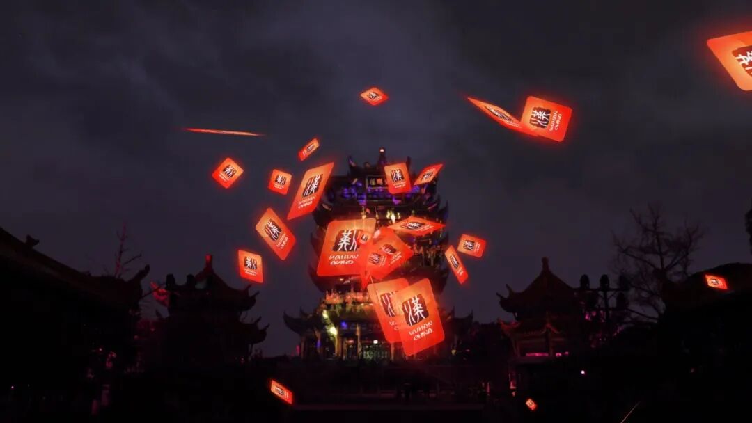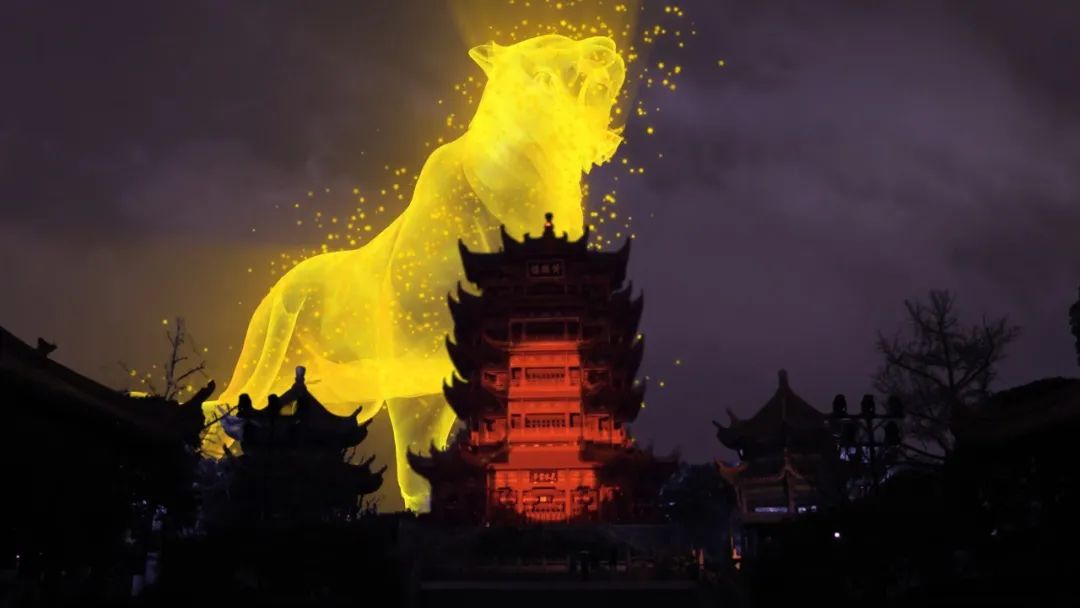 首次将XR技术运用在真实场景光影秀中,黄鹤、凤凰、萌虎等虚拟场景被完美叠加在真实的黄鹤楼光影秀上(前方多图预警,建议在wifi网络下浏览)
