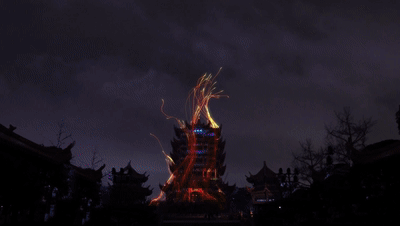 彩色的烟花弹划破天际伴随着5秒倒计时光影秀正式开始