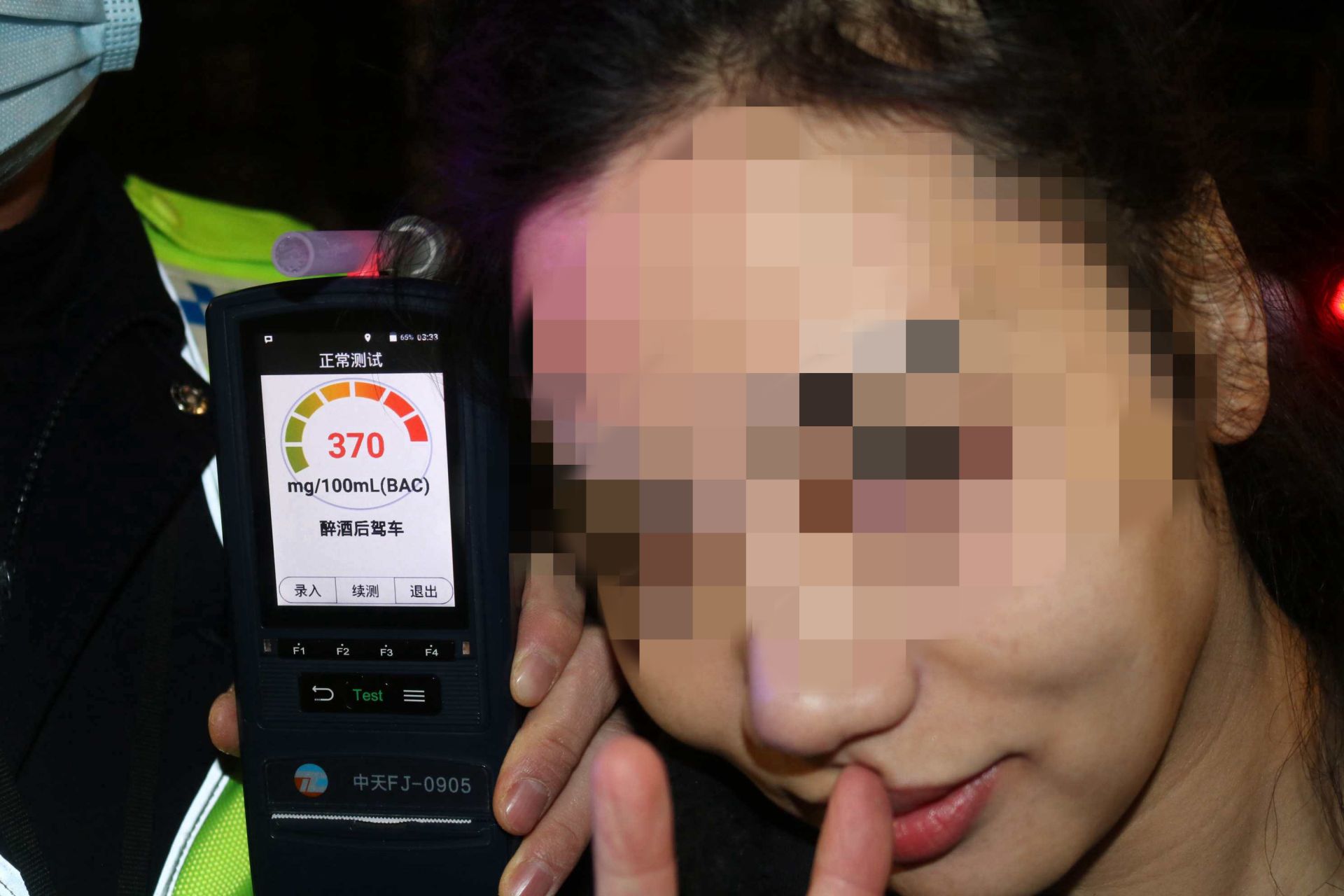 在要求接受酒精呼气检测的时候,彭某突然变得暴躁不安,各种不配合,声称是别人扎破了她车的轮胎。在朋友的劝说下,经过十多分钟的反复接受呼气式酒精检测仪器的检测后,结果显示其酒精含量为370mg/100m1,超过醉驾标准4倍有余,涉嫌醉驾。在拍照取证过程中,彭某又开始各种不配合,摆出各种可爱的姿势与酒精检测器进行拍照,俨然将事故现场当成自己的直播间。