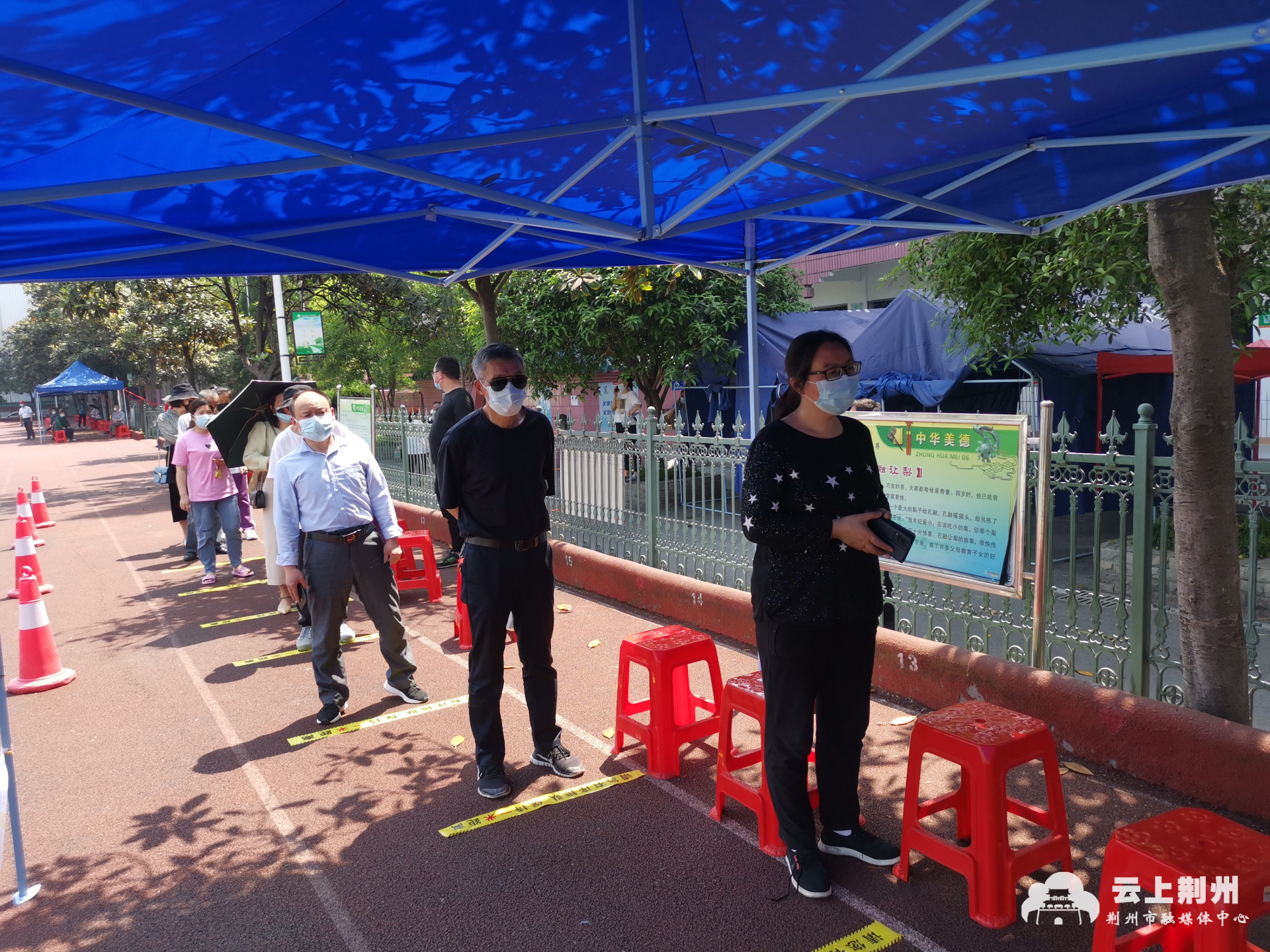 荆州实验中学老校区是荆州区西城街道文庙社区的核酸采集点之一。记者在现场看到,在工作人员的引导下,居民们间隔1米,有序排队进行核酸采集。10号晚上文庙社区接到上级通知后,社区工作人员连夜对辖区两个核酸检测点进行布置,并在11号上午10点顺利启动核酸检测工作。
