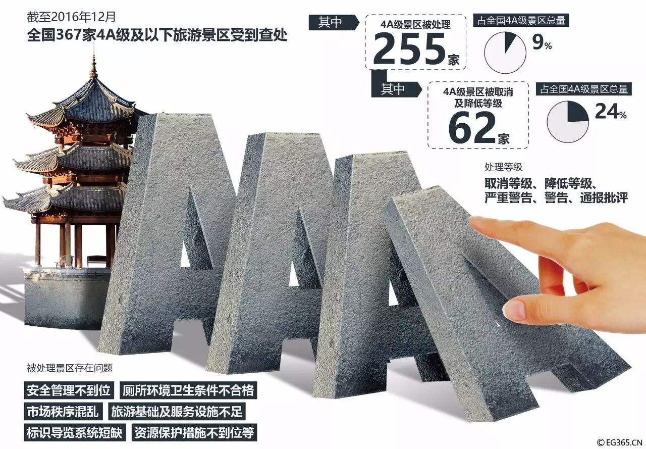 国家旅游局通报,截至目前,全国31个省(区、市)及新疆生产建设兵团旅游管理部门均已完成对本地区4A级及以下景区的复核整治。全国共有367家A级景区分别受到取消等级、降低等级、严重警告、警告、通报批评等处理。其中共有255家4A级景区被处理,占全国4A级景区总量的9%;62家4A级景区被摘牌或降级,占被处理4A级景区的24%。