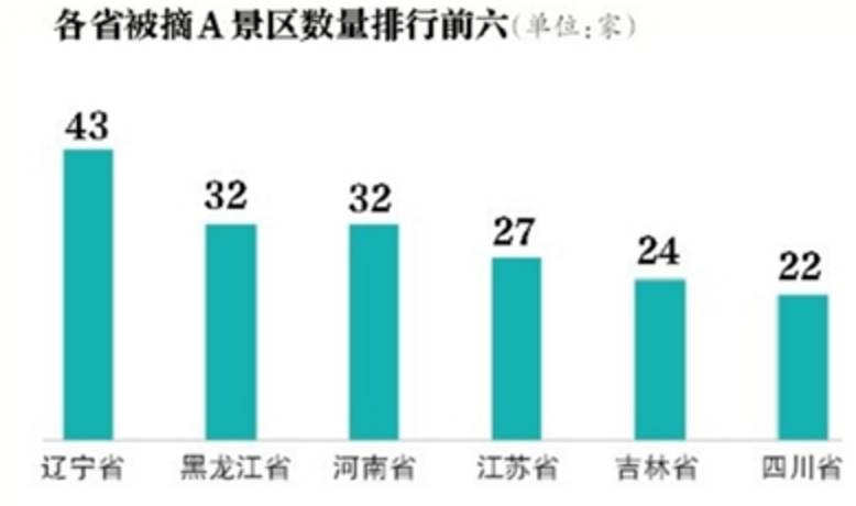 辽宁、黑龙江、河南、江苏、吉林和四川等6省本次处理A级景区超过20家,另有福建、安徽、湖北、广东、湖南、内蒙古和海南等7省处理 A级景区超过10家。