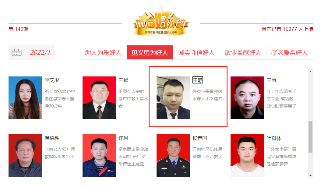 2022年第一季度“中国好人榜”发布仪式暨全国道德模范与身边好人现场交流活动,以“云”发布方式在北京市密云区新时代文明实践中心推出。监利市新沟镇前进社区居民王静,上榜“中国好人榜”,被评为2022年第一季度见义勇为“中国好人”。去年11月26日,新沟镇全心村一位老奶奶在监新河边舀水时不慎滑入河中,路过的小哥王静见状立刻跳入水中营救,不幸遇难,年仅32岁。
