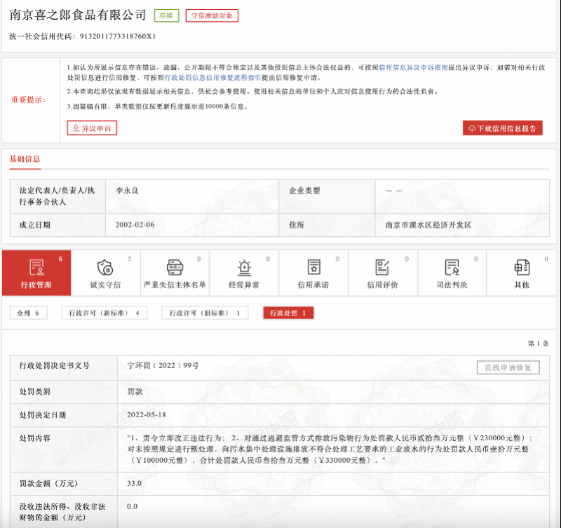 6月2日,南都记者从信用中国官网获悉,近日,南京市生态环境局对江苏南京喜之郎食品有限公司逃避监管、违法排污罚款33万元。