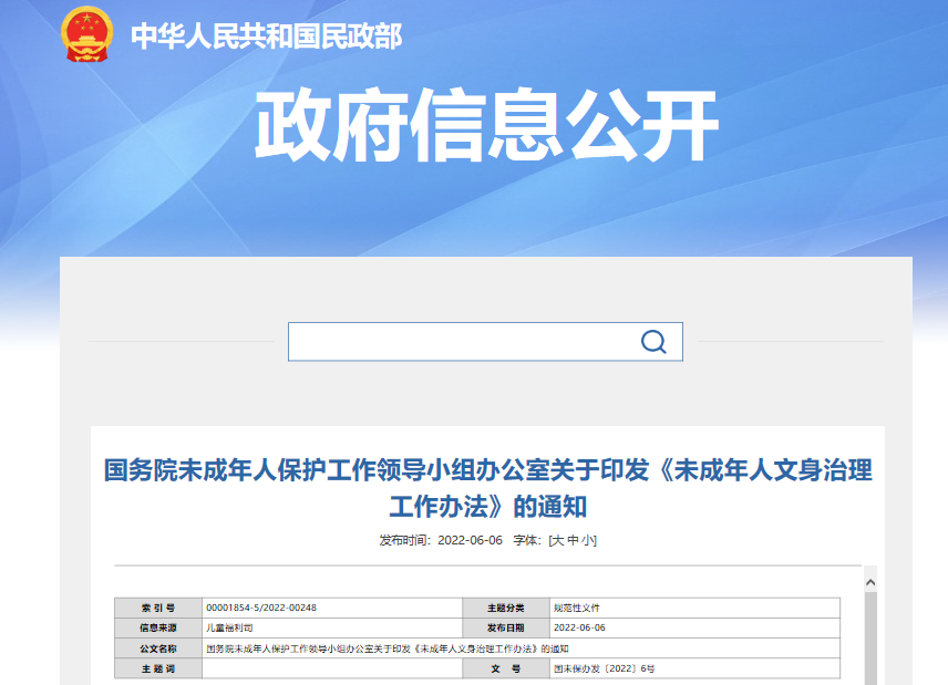 据民政部网站消息,为加强未成年人文身治理,保护未成年人身心健康,经商中央宣传部、中央网信办、最高人民法院、最高人民检察院、教育部、公安部、民政部、司法部、商务部、卫生健康委、市场监管总局、广电总局、共青团中央、全国妇联达成一致,2022年6月6日,国务院未成年人保护工作领导小组办公室印发《未成年人文身治理工作办法》(以下简称《办法》),对加强未成年人文身治理提出系列工作举措。