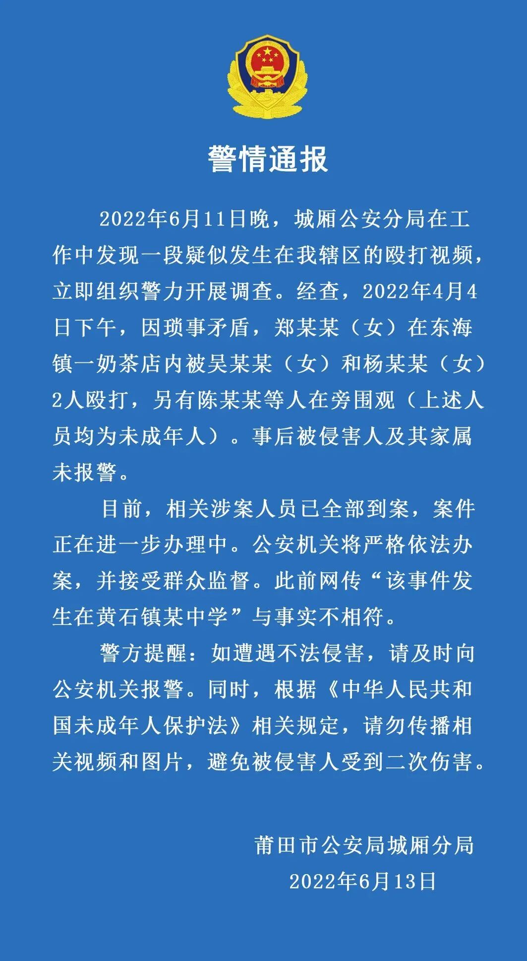 6月13日23时许,微信公号“城厢公安”发布警情通报称:2022年6月11日晚,城厢公安分局在工作中发现一段疑似发生在我辖区的殴打视频,立即组织警力开展调查。经查,2022年4月4日下午,因琐事矛盾,郑某某(女)在东海镇一奶茶店内被吴某某(女)和杨某某(女)2人殴打,另有陈某某等人在旁围观(上述人员均为未成年人)。事后被侵害人及其家属未报警。