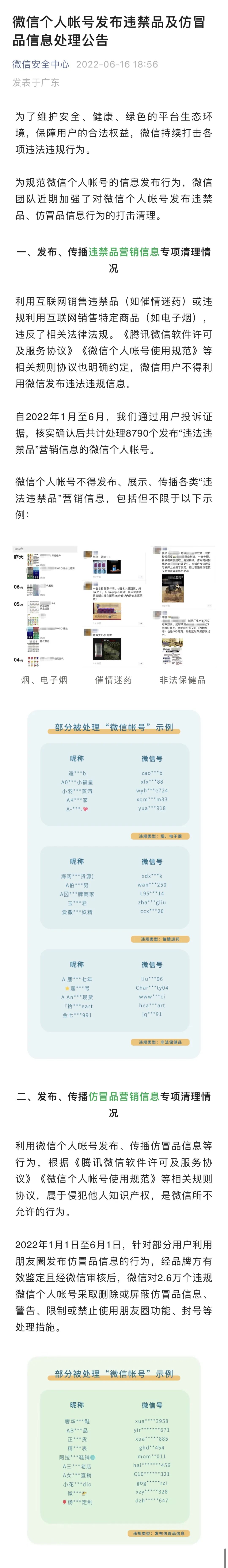 “微信安全中心”16日发布《微信个人帐号发布违禁品及仿冒品信息处理公告》称,近期加强了对微信个人帐号发布违禁品、仿冒品信息行为的打击清理。