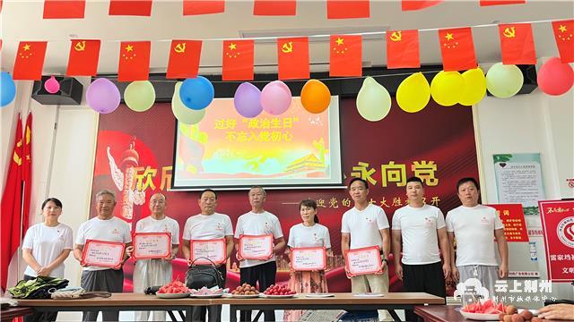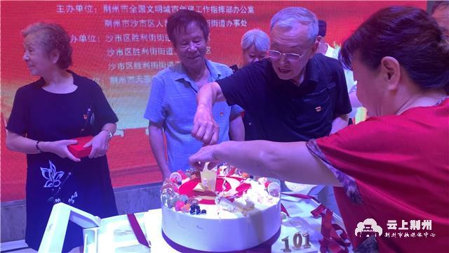 活动现场,沙市区胜利街道相关负责人还为社区在党50年的老党员颁发纪念章,并一起切生日蛋糕,共庆党的生日。