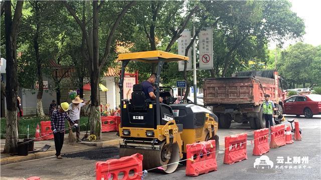 今天(7月6日)上午10点半,记者来到园林路中山公园东大门路段,看到施工人员正在对挖开的路段铺设沥青,工人用铲子将沥青推平后压路机将其压平。 “目前园林路雨污分流工程已经接近尾声,正在进行路面沥青恢复,预计本周末园林路可以全部恢复完成,江汉路上周车行道已经全部恢复完成,下周预计实行跨江津路非开挖工程,工期一个月,对交通影响较小,主要在人行道上。”荆州市荆江环境科技有限公司工程管理部副经理聂伟介绍。