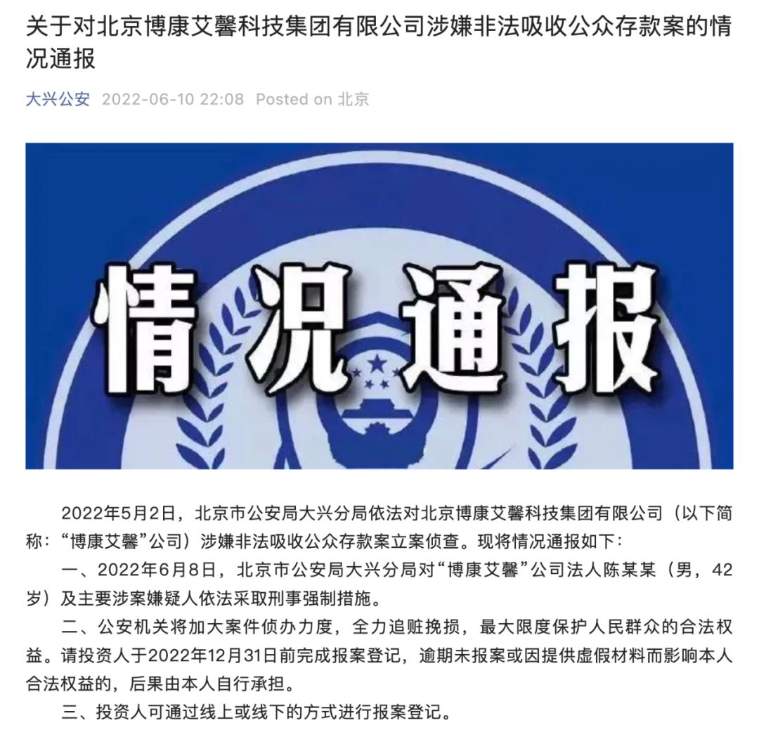 7月7日,北京市公安局大兴分局发布《关于对北京博康艾馨科技集团有限公司涉嫌非法吸收公众存款案的情况通报(二)》。