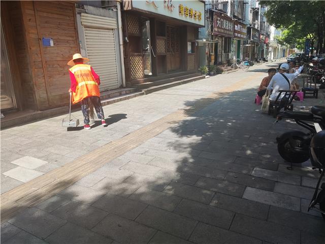 艳阳高照,室外温度已经达到37℃,荆东路上,64岁的环卫工人张林珍和同伴正在仔细清扫路面垃圾和落叶,张林珍做环卫工作已经有20个年头,最让她难受的就是夏天,高温天气下,清扫一圈下来,全身都会被汗水浸湿,自己带的水也会很快喝完。
