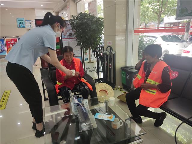 好在不远处就有一处爱心歇脚点”,工作人员热情邀请她们进去歇脚纳凉,为她们端来了凉水,大厅里面还贴心准备了爱心药箱,以备不时之需。