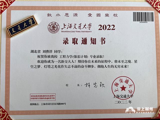 经过层层筛选和高考的稳定发挥,刘曹洋被顺利录取,即将在上海交通大学工程力学专业开启本硕博连读的征程,继续以矢志不渝的奋斗脚步拥抱人生的无穷未来。