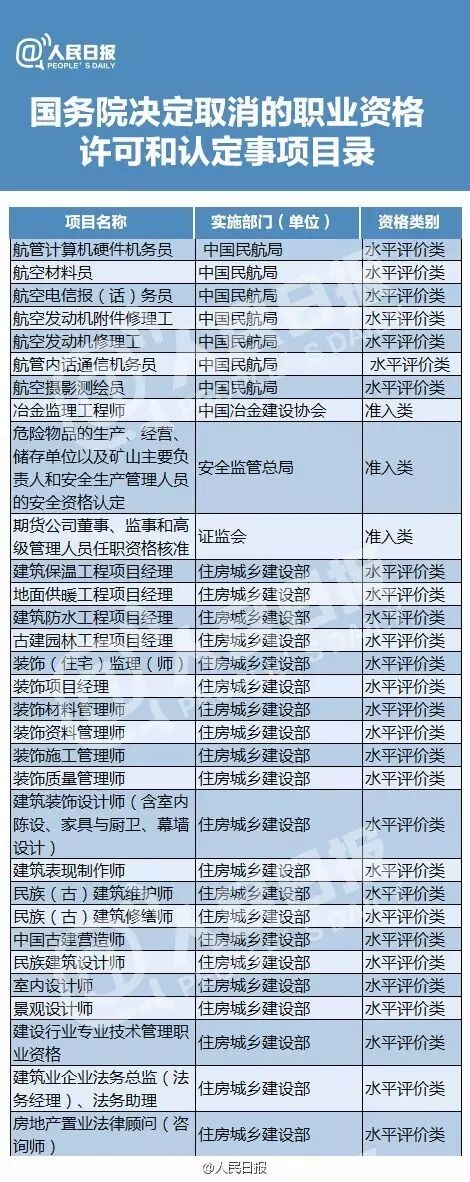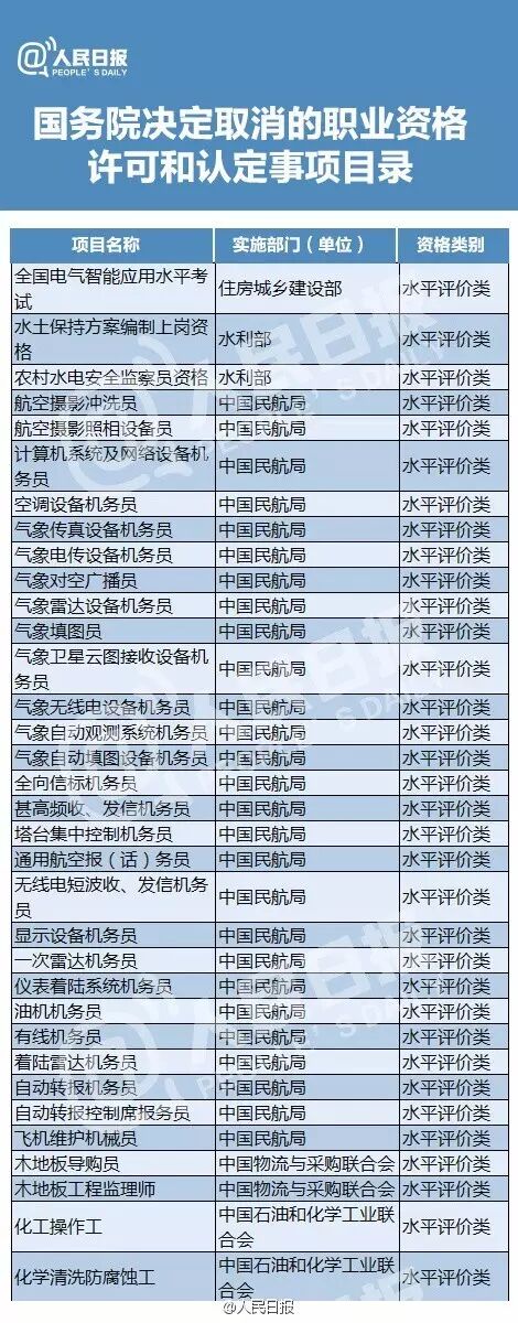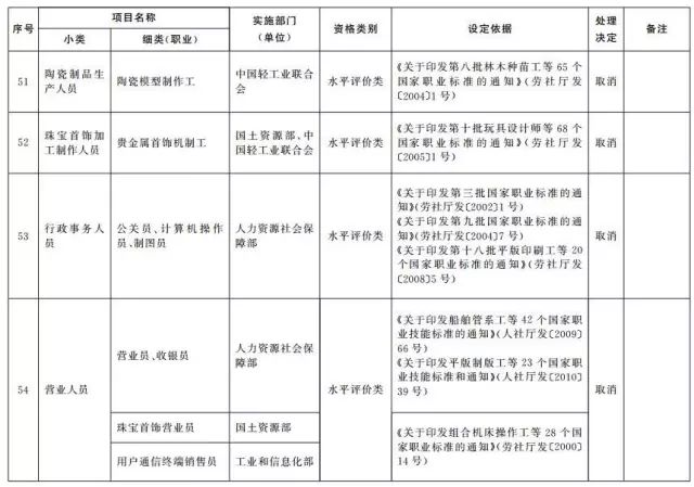 本次取消的职业资格许可和认定事项中,专业技术人员职业资格7项,其中准入类3项,水平评价类4项,涉及公路水运工程监理、防雷、管理咨询等领域;技能人员职业资格107项,均为水平评价类,涉及机械设备、食品加工和农业、文化、轻工等多个领域。