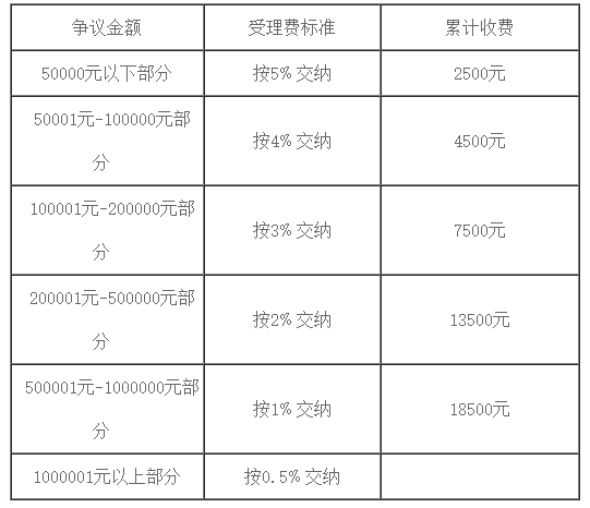 根据《仲裁委员会仲裁收费办法》(国办发[1995] 44号)文件规定,制定以下收费标准:一、 案件受理费:争议金额受理费标准累计收费50000元以下部分按5﹪交纳2500元50001元-100000元部分按4﹪交纳4500元100001元-200000元部分按3﹪交纳7500元200001元-500000元部分按2﹪交纳13500元500001元-1000000元部分按1﹪交纳18500元1000001元以上部分按0.5﹪交纳