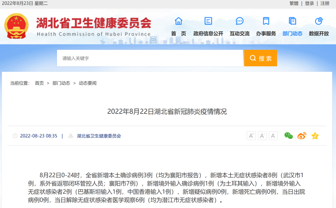刚刚,湖北省卫生健康委员会官网发布《2022年8月22日湖北省新冠肺炎疫情情况》,全文如下: