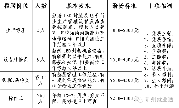 2、赫天光电,普工,男16-35岁,女16-40岁,可接受中专实习生100人,身心健康,吃苦耐劳,月工资3200元以上,管吃住。