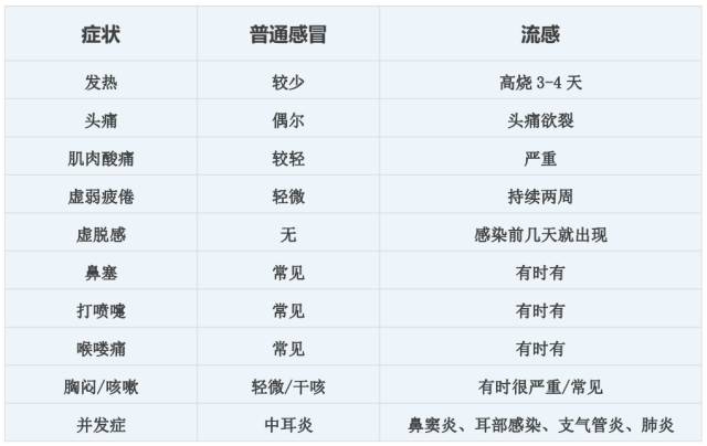 (注:光凭症状很难准确区分两者,如果怀疑是流感,建议去正规医院就诊检查。下文提到的“感冒”均为普通感冒。)