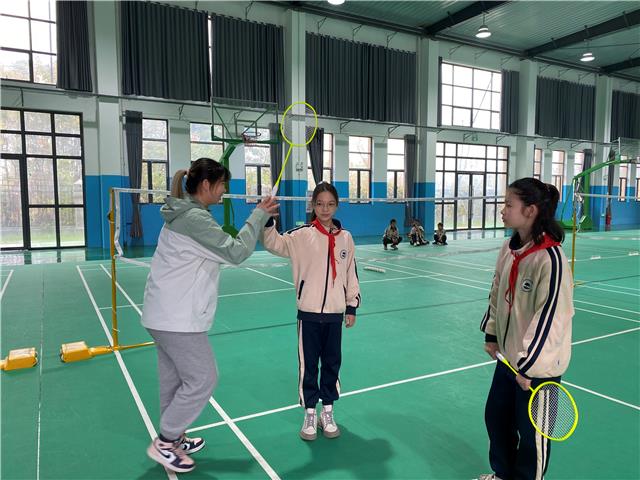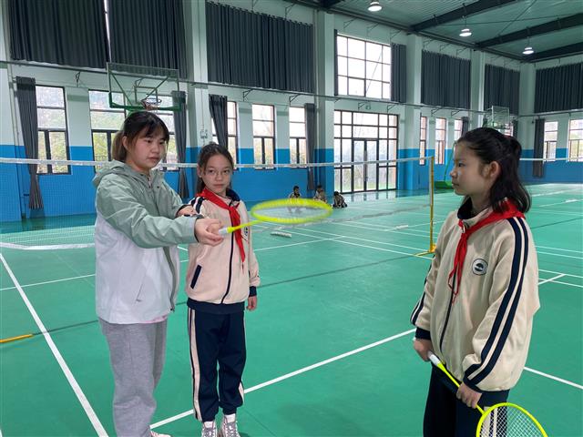 上午9点,在荆州经开区第一小学羽毛球训练馆内,荆州荆羽俱乐部教练游静琳和学校体育老师王严娇正在进行羽毛球教学,手把手教学员杀球要领。