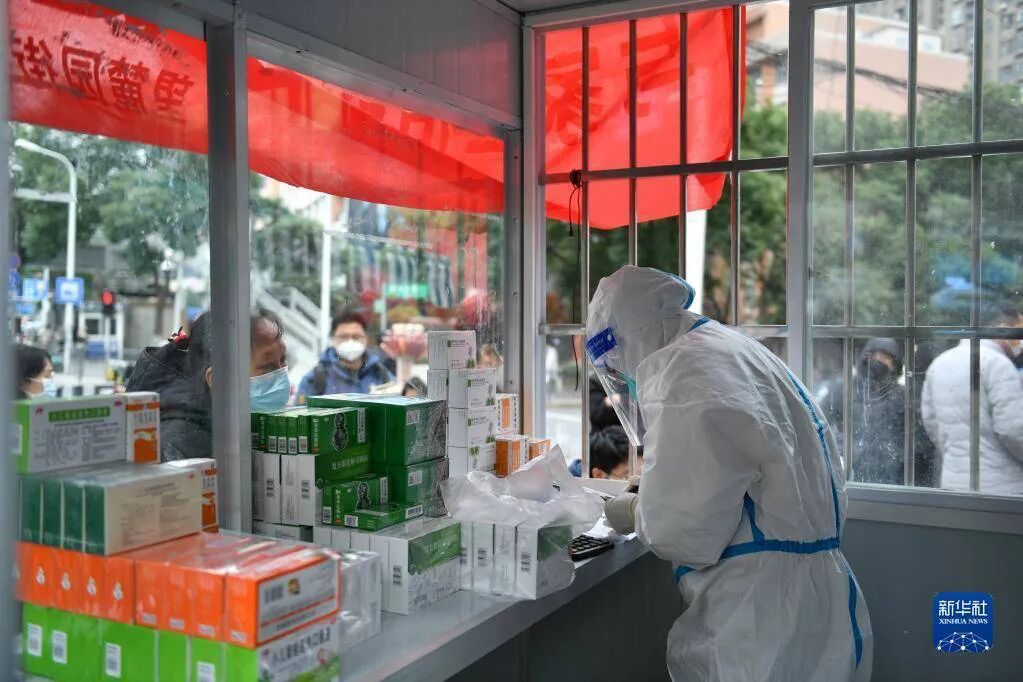 12月20日,医务人员在湖南省长沙市开福区望麓园街道社区卫生服务中心发热诊疗站给患者配药。新华社记者 陈振海 摄