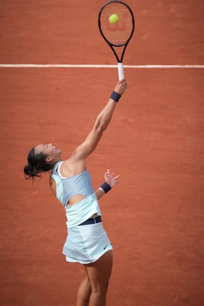5月26日,中国选手郑钦文在比赛中发球。新华社记者 孟鼎博 摄