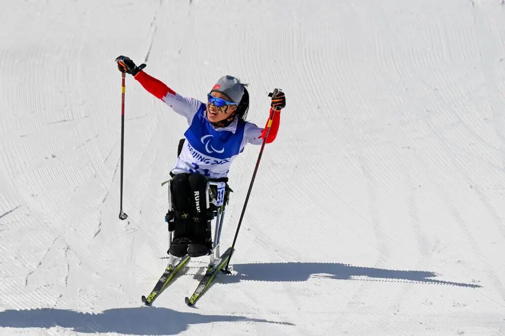 这是3月6日中国选手杨洪琼在残奥越野滑雪女子长距离(坐姿)比赛后庆祝。新华社记者 李博 摄