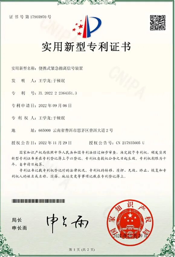 前不久,由云南省普洱市景东县消防救援大队三级消防士王学龙、消防站站长于桠珉共同研发的“便携式紧急撤离信号装置”获国家知识产权局授权的“实用新型专利证书”。