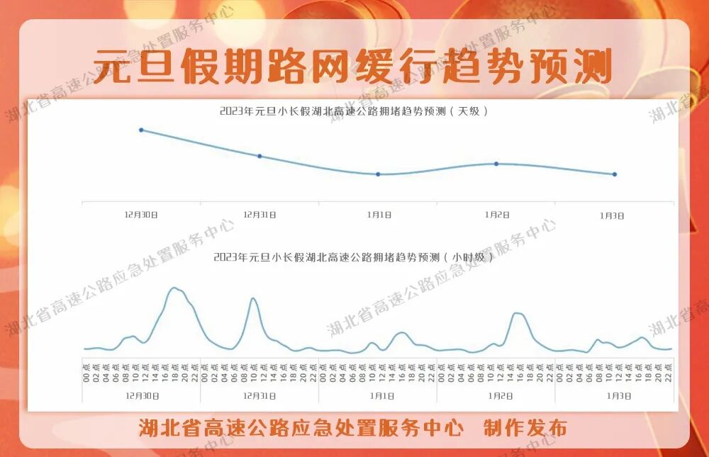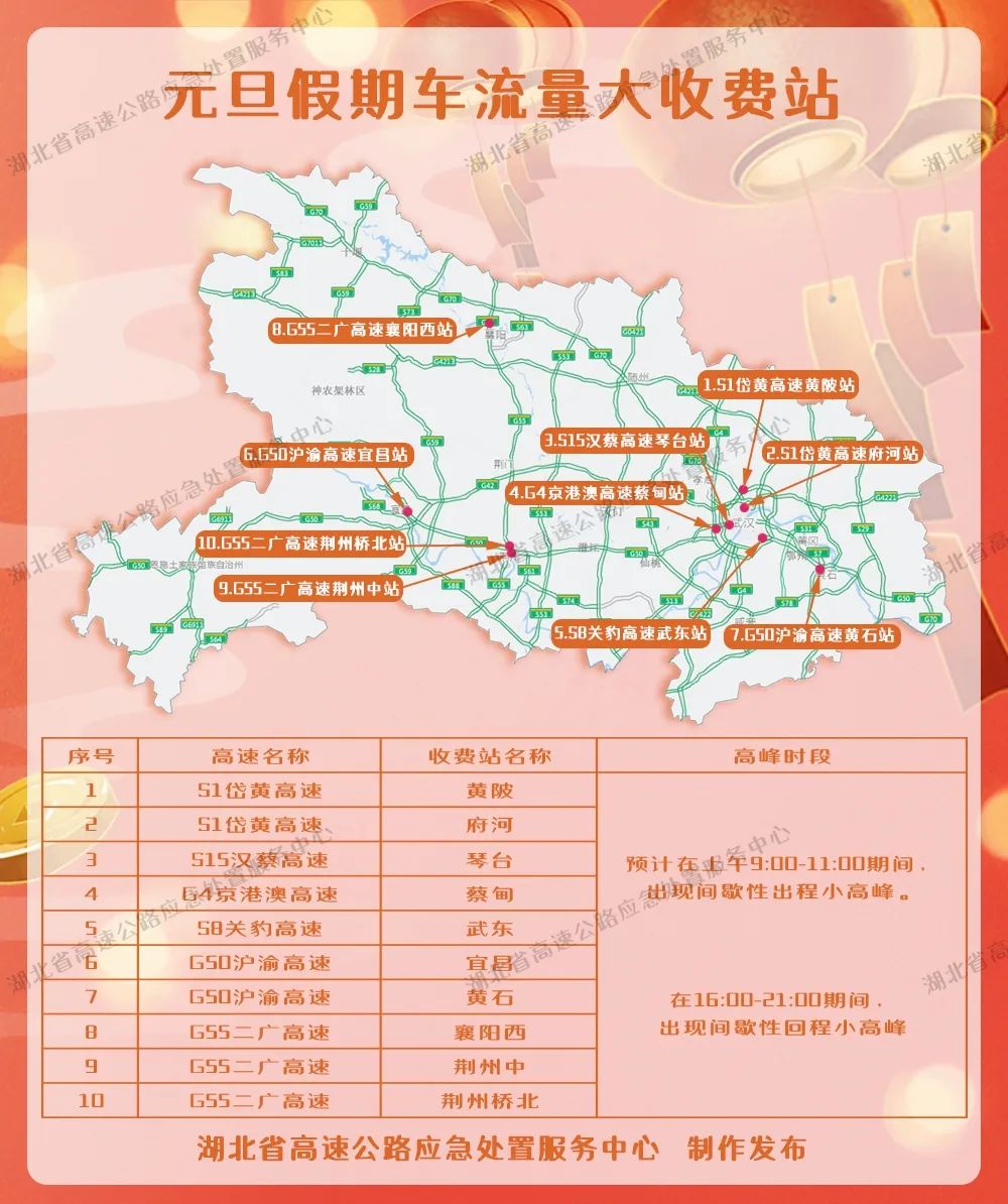 据预测,元旦假期高速路网整体车流量将呈现“前高后缓”态势,12月30日16时至20时出现第一波去程小高峰,12月31日(假期首日)9时至11时出现出行高峰,2023年1月2日(假期第三天)16时至20时出现回程小高峰;车流量较大的收费站有岱黄高速的黄陂、府河收费站,汉蔡高速的琴台收费站、关豹高速的武东收费站、京港澳高速蔡甸收费站以及沪渝高速的宜昌、黄石等收费站。此间,沪渝高速贺家坪至榔坪、永安至仙桃、豹澥至鄂州、蕲春至武穴段,二广高速襄阳南至襄阳西段,沪蓉高速汉川至东西湖段、东西湖互通,福银高速黄梅互通等路段在高峰时段预计通行缓慢。