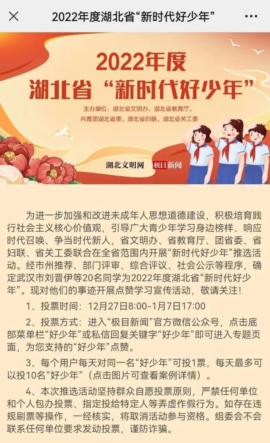 经市州推荐、部门评审、综合评议、社会公示等程序,确定荆州市沙市区的袁语珑(8号)和刘君浩(9号)等20名同学为2022年度湖北省“新时代好少年”。