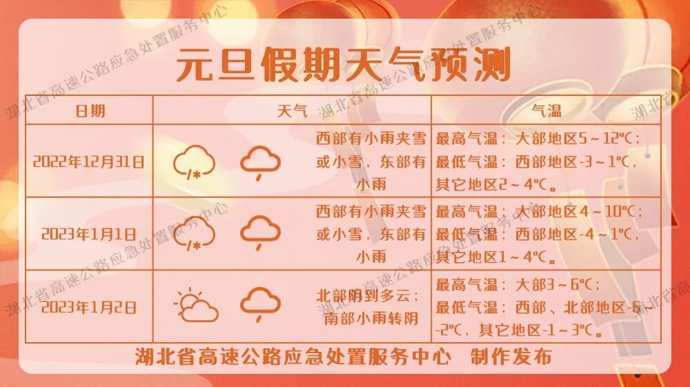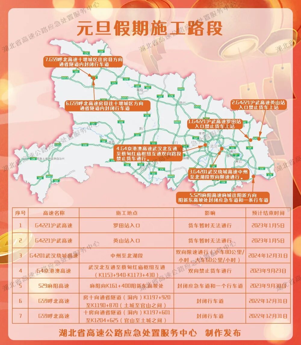 据预测,元旦假期高速路网整体车流量将呈现“前高后缓”态势,12月30日16时至20时出现第一波去程小高峰,12月31日(假期首日)9时至11时出现出行高峰,2023年1月2日(假期第三天)16时至20时出现回程小高峰;车流量较大的收费站有岱黄高速的黄陂、府河收费站,汉蔡高速的琴台收费站、关豹高速的武东收费站、京港澳高速蔡甸收费站以及沪渝高速的宜昌、黄石等收费站。此间,沪渝高速贺家坪至榔坪、永安至仙桃、豹澥至鄂州、蕲春至武穴段,二广高速襄阳南至襄阳西段,沪蓉高速汉川至东西湖段、东西湖互通,福银高速黄梅互通等路段在高峰时段预计通行缓慢。