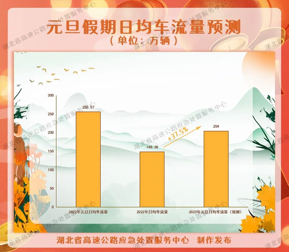12月29日,湖北省高速公路应急处置服务中心发布信息:2023年元旦3天假期内,高速公路不实行免费通行政策,预计高速路网出入口日均车流量超200万辆,较平时上升37.5%,路网流量以省内中短途返乡及短途自驾游为主,省内各大中型城市周边高速公路部分路段、收费站通行压力较大。