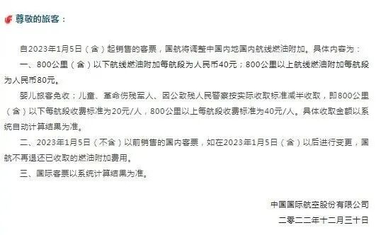 自2023年1月5日(含)起销售的客票,800公里(含)以下航线燃油附加费每航段为人民币40元;800公里以上航线燃油附加费每航段为人民币80元。