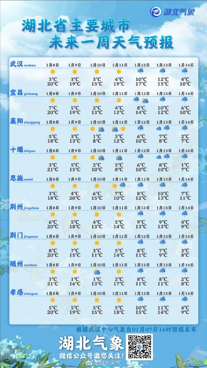 20℃左右的暖意还将持续2天。武汉周日和下周一均为20℃,需要注意的是早晚低温仅为3℃,所以早晚要加强防寒保暖。全省来看,周日和下周一都是妥妥的晴天,周日湖北大部地区高温为18-21℃,下周一鄂北14-17℃、鄂南17-20℃,低温都是个位数:鄂北2-5℃、鄂南5-7℃。