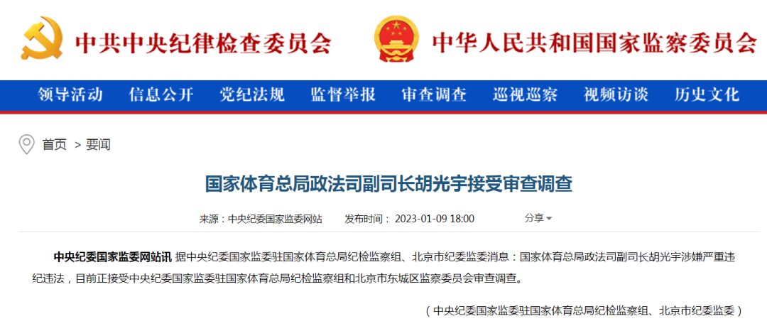 国家体育总局胡光宇被查 2023-01-09 20:01 中央纪委国家监委网站 0 据中央纪委国家监委驻国家体育总局纪检监察组、北京市纪委监委消息:国家体育总局政法司副司长胡光宇涉嫌严重违纪违法,目前正接受中央纪委国家监委驻国家体育总局纪检监察组和北京市东城区监察委员会审查调查。