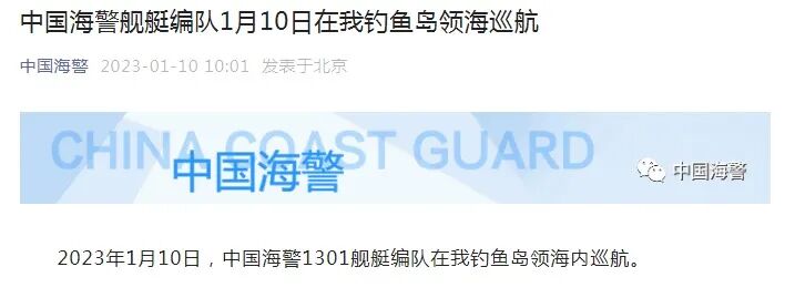 2023年1月10日,中国海警1301舰艇编队在我钓鱼岛领海内巡航。