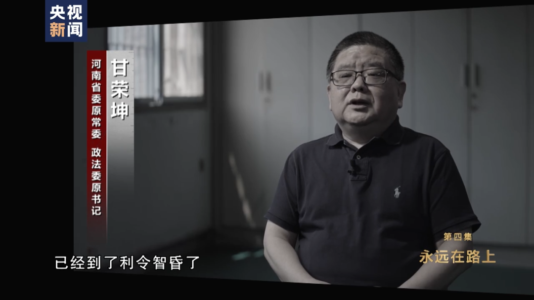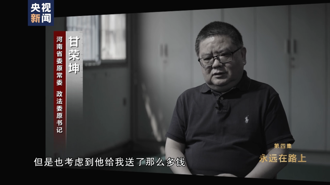 四集电视专题片《永远吹冲锋号》第四集《永远在路上》,1月10日在中央电视台综合频道晚8点档播出。片中披露了河南省委原常委、政法委原书记甘荣坤知法违法、干预司法、收受巨额财物、司法腐败、政治腐败和经济腐败等违法违纪行为。