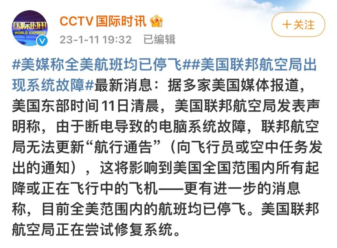 据多家美国媒体报道,美国东部时间11日清晨,美国联邦航空局发表声明称,由于断电导致的电脑系统故障,联邦航空局无法更新“航行通告”(向飞行员或空中任务发出的通知),这将影响到美国全国范围内所有起降或正在飞行中的飞机——更有进一步的消息称,目前全美范围内的航班均已停飞。