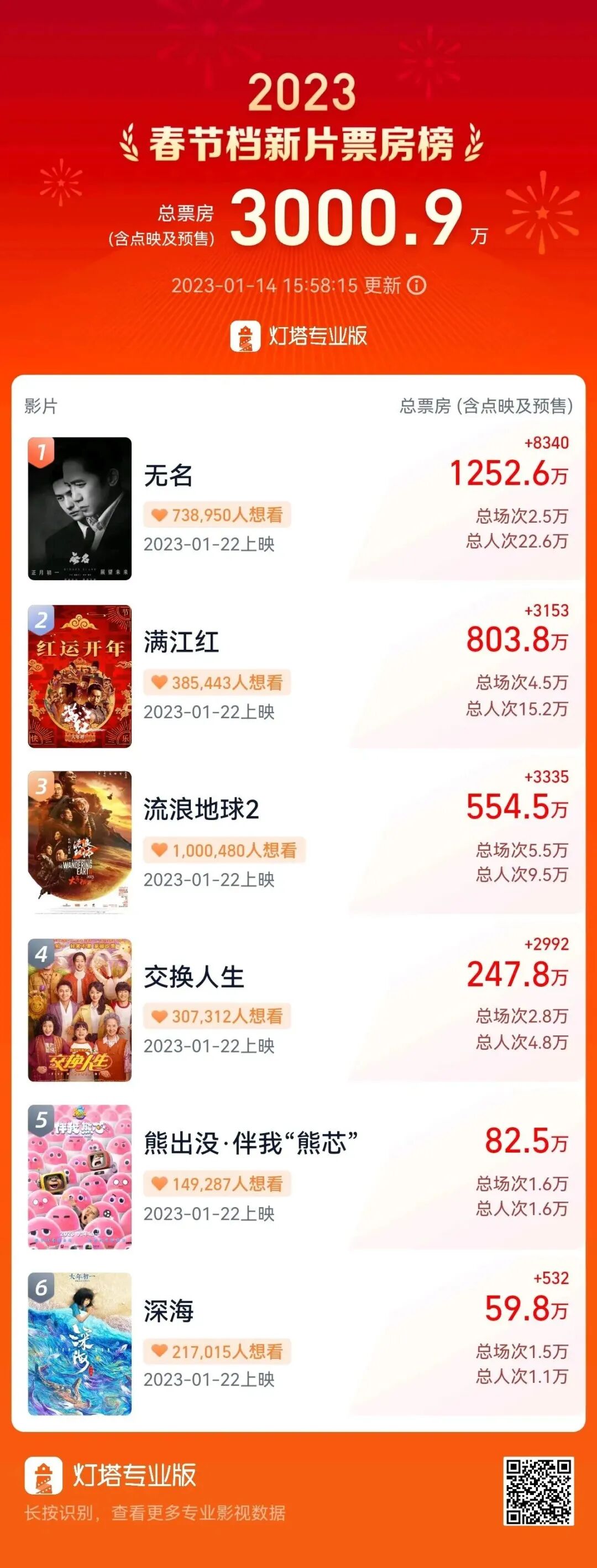 总排片方面,截至1月14日15时许,《流浪地球2》排映5.5万场,《满江红》4.5万,《交换人生》2.8万,《无名》2.5万,《熊出没》1.6万,《深海》1.5万。