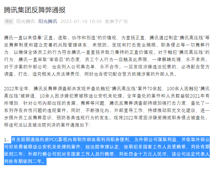 1月16日,“阳光腾讯”发布腾讯集团反舞弊通报,其中提到,有关前期通报的原PCG影视内容制作部张萌利用职务便利,为外部公司谋取利益,并收取外部公司好处费被移送公安机关处理的案件,经法院审理认定,张萌犯非国家工作人员受贿罪,判处有期徒刑三年。