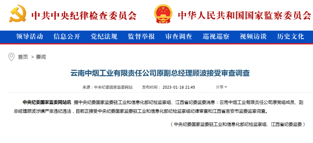 云南中烟工业有限责任公司原党组成员、副总经理顾波涉嫌严重违纪违法,目前正接受中央纪委国家监委驻工业和信息化部纪检监察组纪律审查和江西省吉安市监委监察调查。