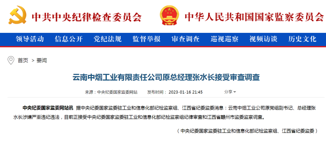 云南中烟工业公司原党组副书记、总经理张水长涉嫌严重违纪违法,目前正接受中央纪委国家监委驻工业和信息化部纪检监察组纪律审查和江西省赣州市监委监察调查。