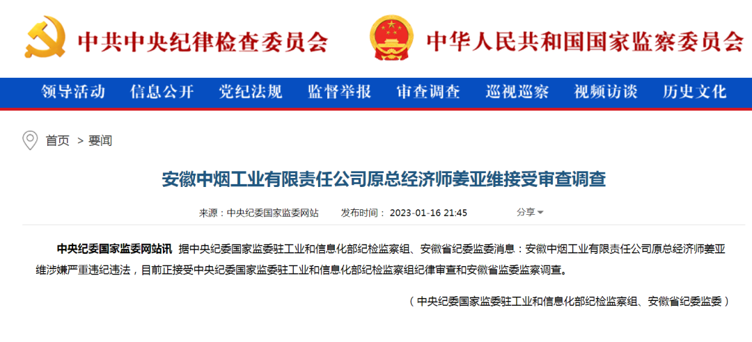 据中央纪委国家监委驻工业和信息化部纪检监察组、安徽省纪委监委1月16日消息:安徽中烟工业有限责任公司原总经济师姜亚维涉嫌严重违纪违法,目前正接受中央纪委国家监委驻工业和信息化部纪检监察组纪律审查和安徽省监委监察调查。