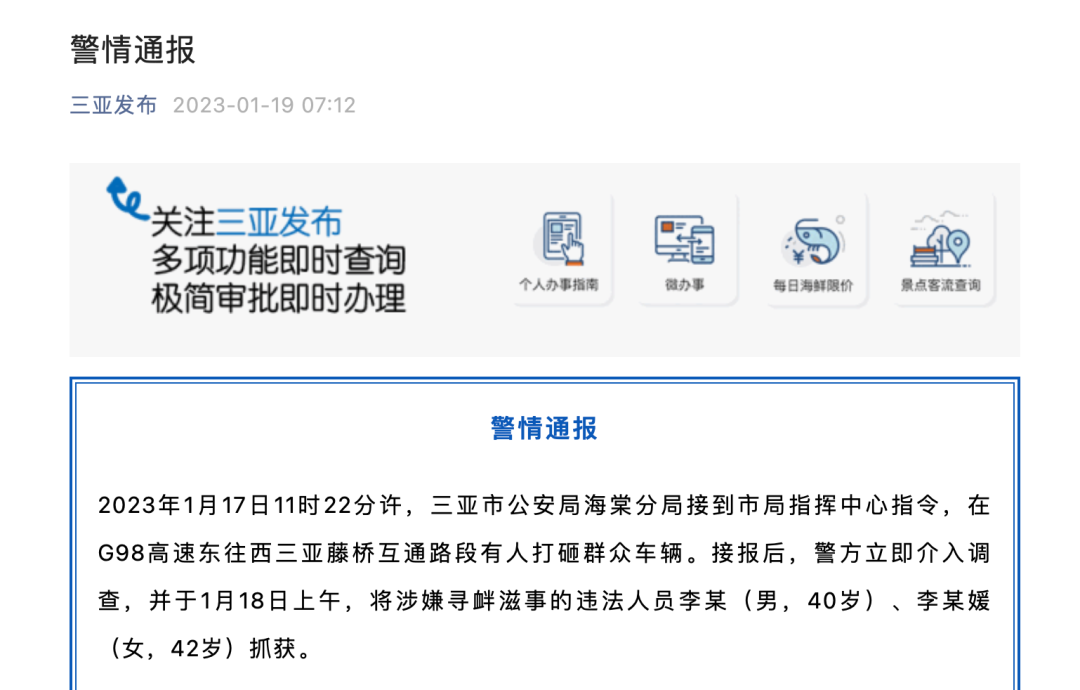 2023年1月17日11时22分许,三亚市公安局海棠分局接到市局指挥中心指令,在G98高速东往西三亚藤桥互通路段有人打砸群众车辆。接报后,警方立即介入调查,并于1月18日上午,将涉嫌寻衅滋事的违法人员李某(男,40岁)、李某媛(女,42岁)抓获。