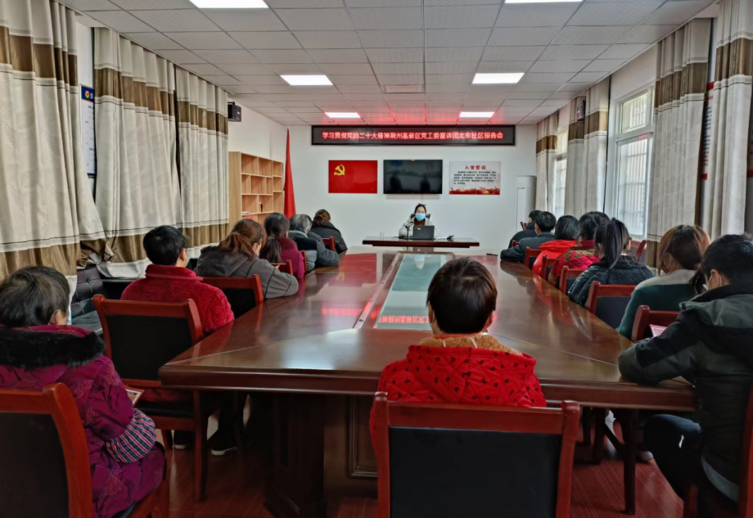 近日,荆州高新区党工委委员、管委会副主任陈任来到太湖港街道太东社区,结合自身学习体会,围绕党的二十大的重大意义、精神实质和丰富内涵,聚焦高新区发展目标,向社区党员干部开展了党的二十大精神宣讲活动。