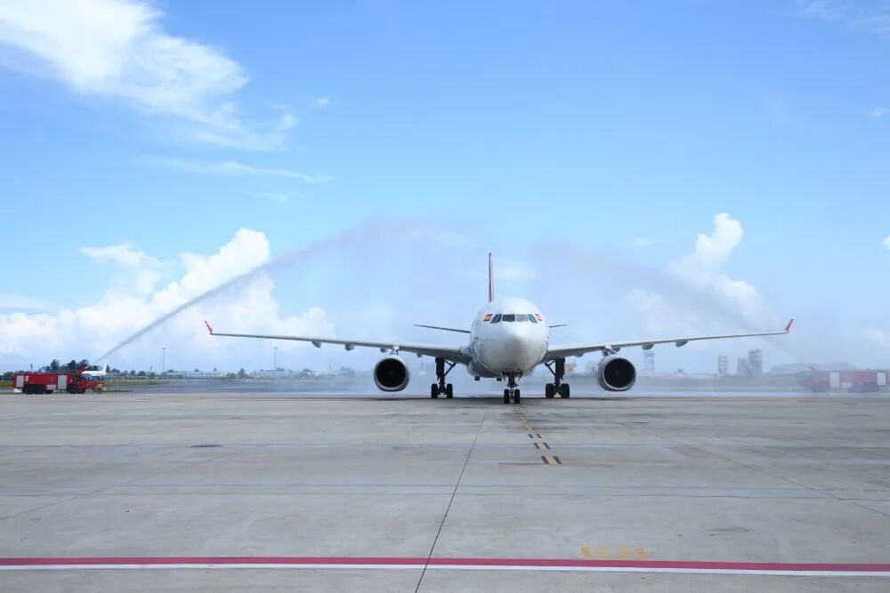 当地时间1月18日中午,中国首都航空JD455航班在马尔代夫维拉纳国际机场平稳降落。客机滑行过程中,马尔代夫政府特意安排消防车在两侧喷射巨型水柱,以水门礼热烈欢迎中国游客的到来。