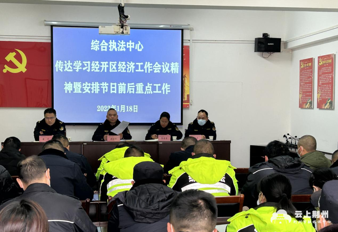 1月18日下午,荆州经开区综合执法中心召开全体干部职工大会,传达学习经开区经济工作会议暨政策奖励兑现会相关精神,并就春节期间重点工作进行安排部署。
